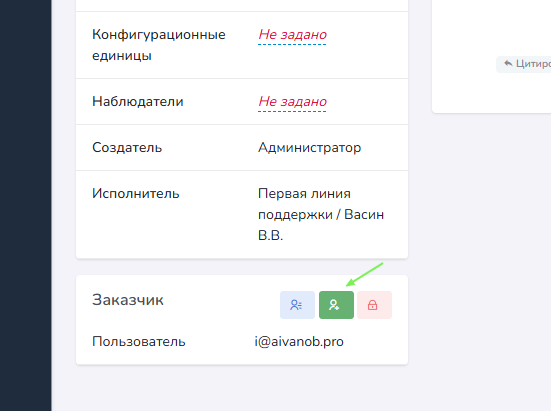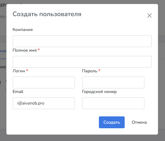 Достаточно нажать на кнопку добавления пользователя напротив email адреса заказчика и заполнить все поля. В поле компания вы можете выбрать уже существующую компанию или ввести название новой компании.