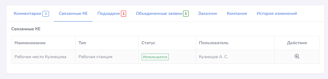 На данной вкладке отображаются КЕ, которые были прикреплены к заявке. В столбце Действия можно открыть КЕ на просмотр.