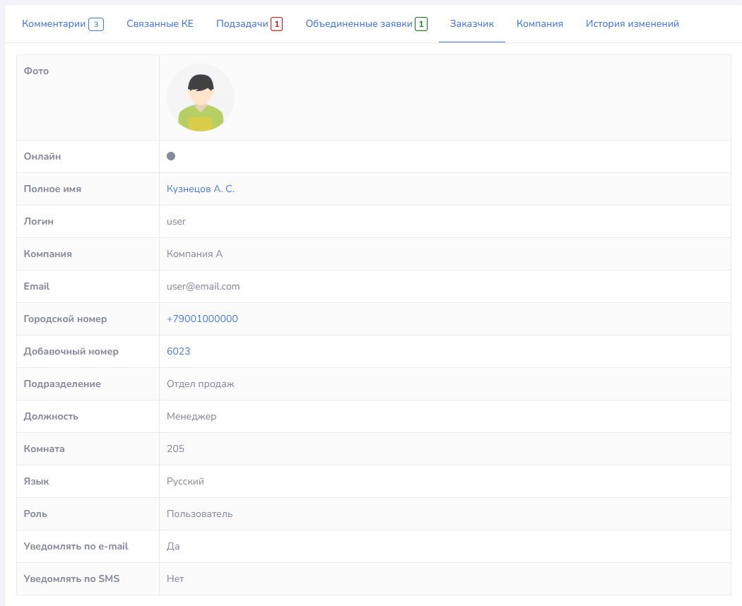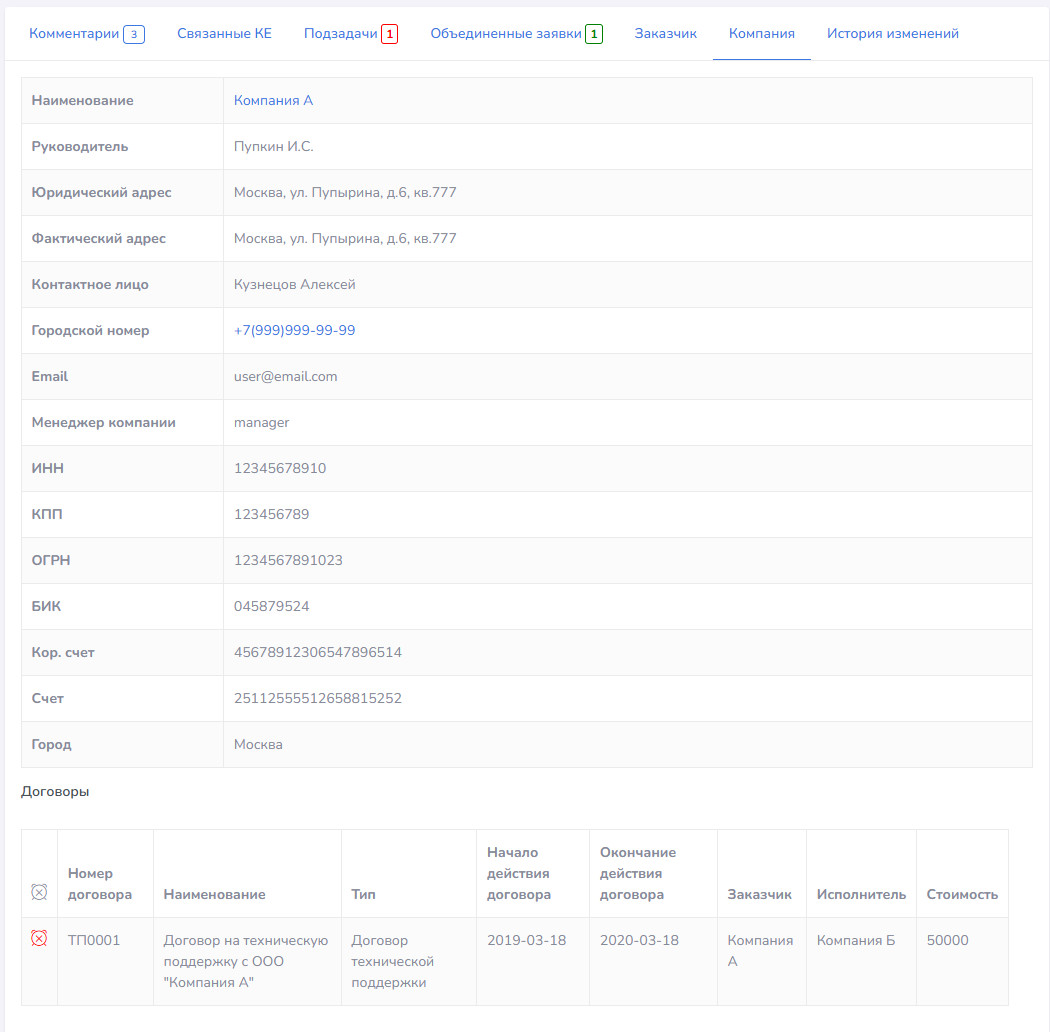 На данных вкладках отображается подробная информация о Заказчике, его контактные данные, возможность выполнить звонок по нажатию на номер телефона. А так же информация о компании заказчика и договорах, активных или законченых.