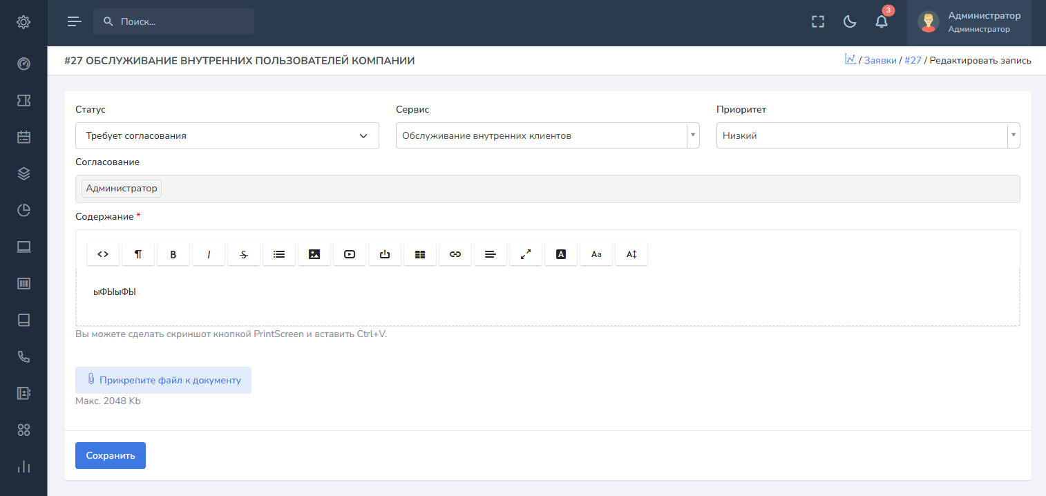 Форма редактирования заявки исполнителем / администратором имеет возможность изменить статус заявки, сервис, если при создании заявки не были заполнены дополнительные поля, приоритет, содержание и добавить новые файлы к заявке.