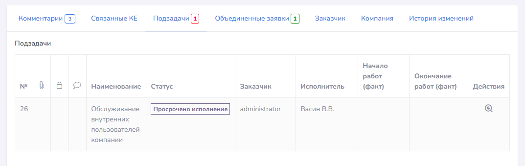 На этой вкладке отображаются подзадачи, которые были автоматически или вручную созданы по шаблону, при создании заявки. Каждая подзадача это отдельная заявка, исеющая свои метрики и своих исполнителей. Есть возможность закпретить закрывать родительскую заявку, пока не закрыты все подзадачи, а так же есть возможность автоматически закрывать родительскую заявку, после того как будут закрыты все подзадачи.