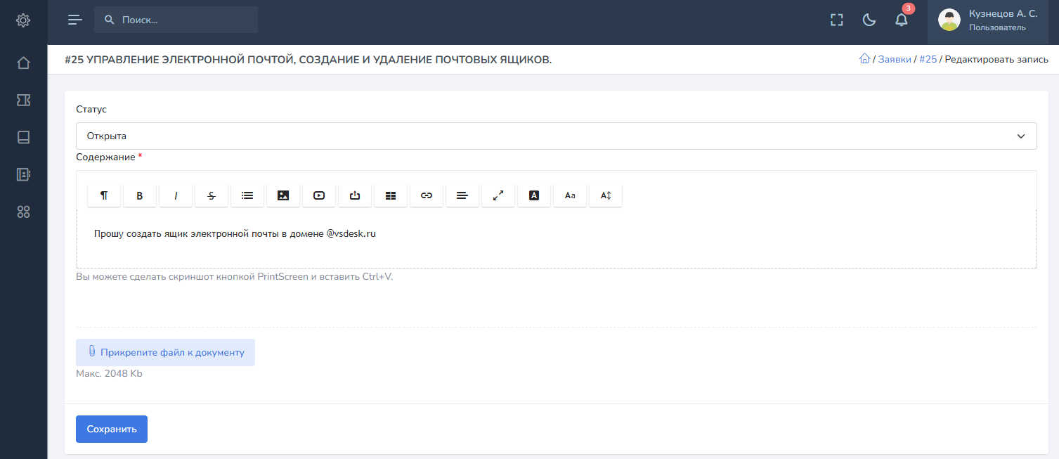 В данной форме у заявителя есть возможность изменения статуса, содержания и добавления вложений.