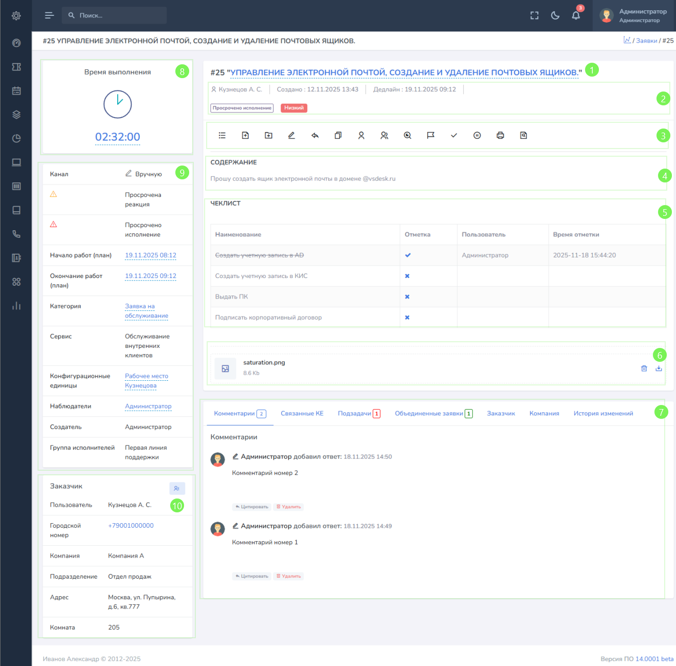 - Панель управления - позволяет вернуться к списку заявок, создать объединенную заявку, подзадачу, редактировать заявку, оставить комментарий (ответ), скопировать заявку как новую, назначить исполнителя и группу исполнителей, наблюдателей, принять заявку в работу, завершить, поставить на паузу, распечатать или выполнить процедуру согласования.