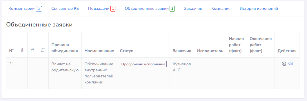 На этой вкладке отображаются заявки, которые были объединены в текущую. В момент объединения заявок, все метрики дочерних заявок заменяются на метрики родительской. В списке объединенных заявок можно открыть заявку на просмотр и при наличии определенных прав объединенные заявки можно открепить. При откреплении заявки, все метрики заявки возвращаются в исходное состояние до объединения. Дополнительно в списке, указывается причина объединения.