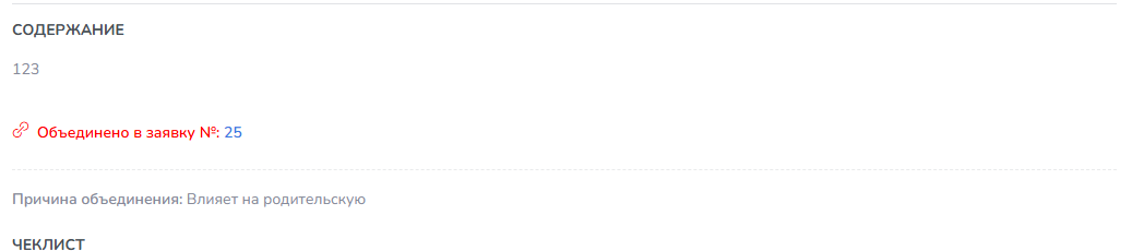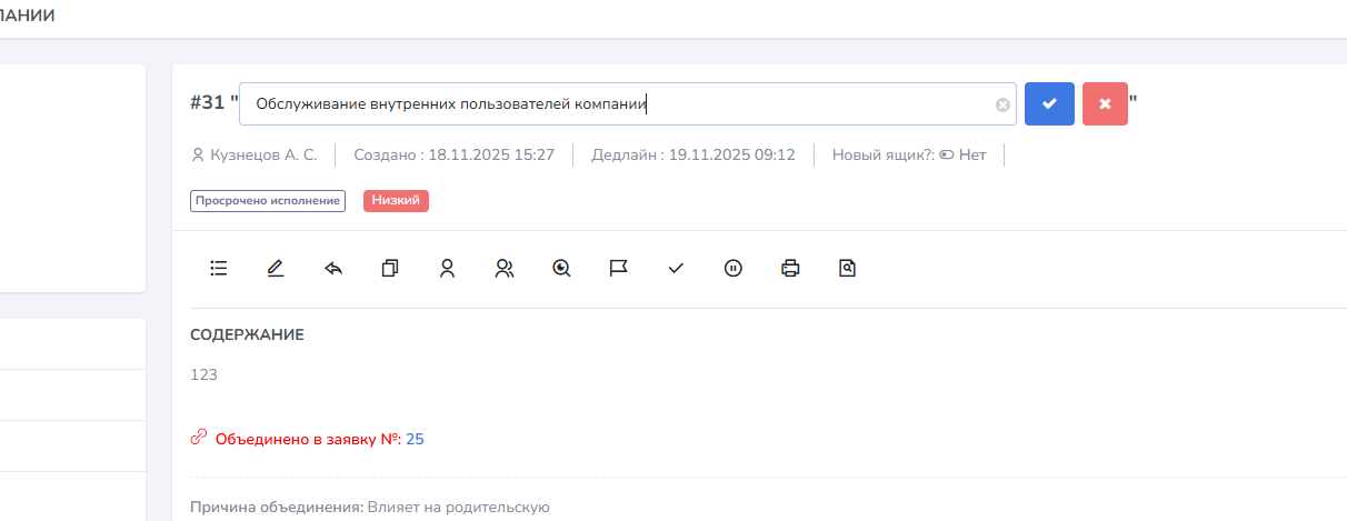 - Содержание - основной текст заявки в HTML формате, с возможностью редактирования на-лету, по клику на текст содержания (при наличии определенных прав). В содержании подзадач и объединенных заявок может отображаться информация о родительской заявке, тексте родительской заявки, ссылка и причина объединения.