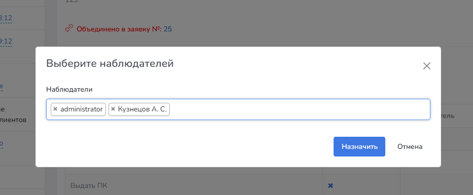 Нажатие на данную кнопку вызывает модельное окно выбора Наблюдателей, она дублирует возможность выбора наблюдателей на лету в панели информации о заявке.