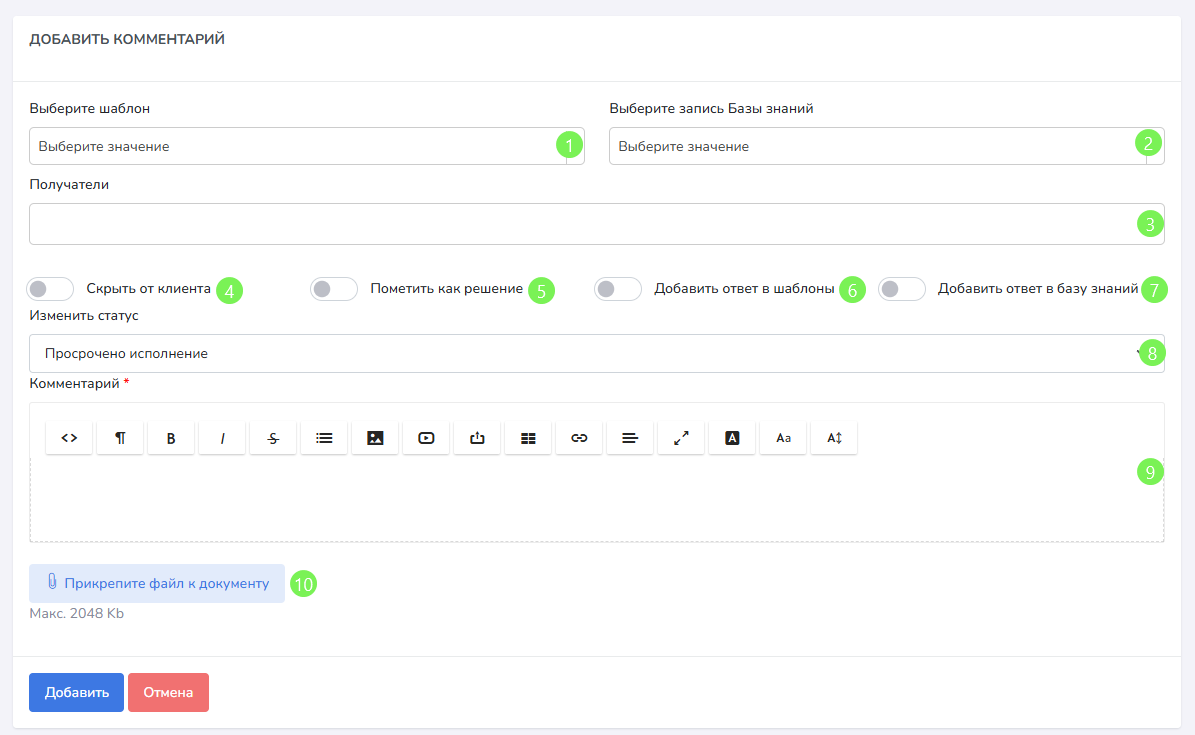 - Выберите шаблон - в данном поле отображается список доступных, для роли пользователя, шаблонов из справочника Шаблоны ответов. При выборе шаблона в текст комментария подставляется текст из шаблона с заменой тегов на реальные значения.