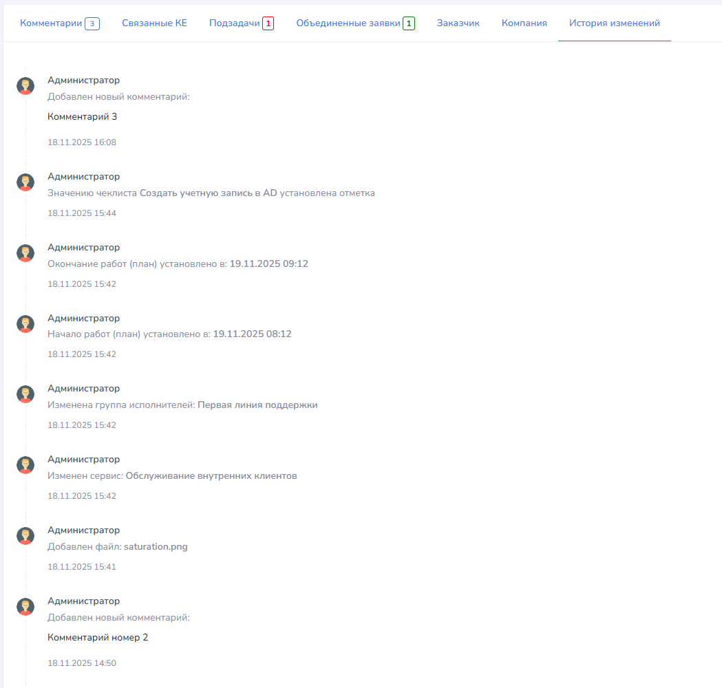 На данной вкладке расположены все изменения заявки в хронологическом порядке.