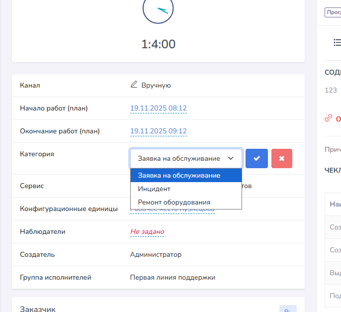 Каждое поле, которое можно отредактировать на лету помечено пунктирной линией и при щелчке мыши на данном поле появляется элемент, в котором можно внести изменения и сохранить нажав на определенную кнопку. Таким образом, можно изменить временные метрики, категорию заявки, КЕ, добавить или изменить наблюдателей, выбрать заказчика, если он не был определен системой. Все эти действия можно выполнить при наличии определенных прав. А также, изменить наименование заявки, без открытия формы редактирования: