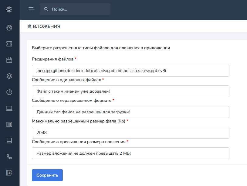 Настройка вложений, применяется ко всем элементам системы, где используются вложения. Меню "Настройки - Вложения".