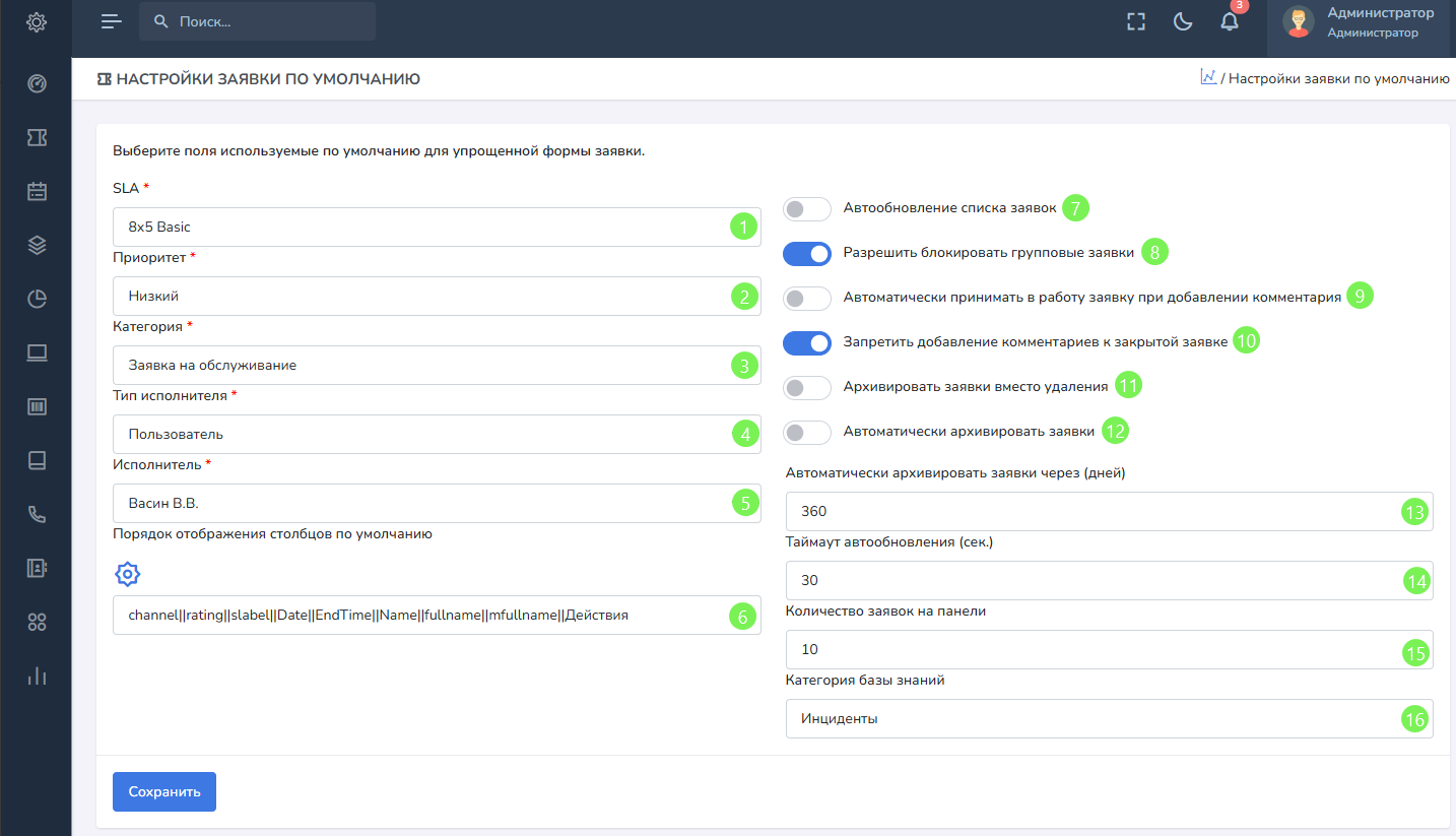 - Автоматически архивировать заявки через (дней) - указывается количество дней, после которого система будет архивировать более старые заявки.