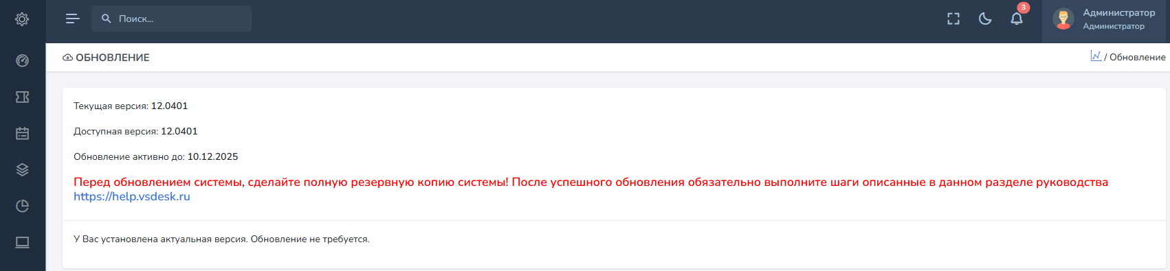 Если у вас закончился срок действия пакета Технической поддержки и обновлений или вы используете Demo версию, то система предупредит вас о том, что обновление недоступно.