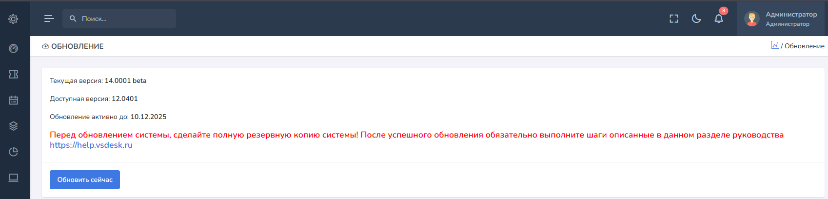 При выходе новых версий в данном меню можно будет увидеть что доступна новая версия для обновления и скачать ее, нажав на кнопку "Обновить сейчас". Подключение к серверу обновлений настраивается при продаже ПО, компанией продавцом и активно только при наличии оплаченной подписки на обновления.