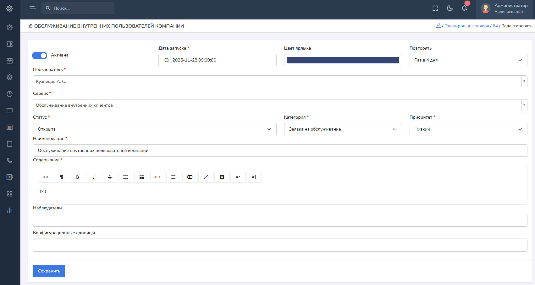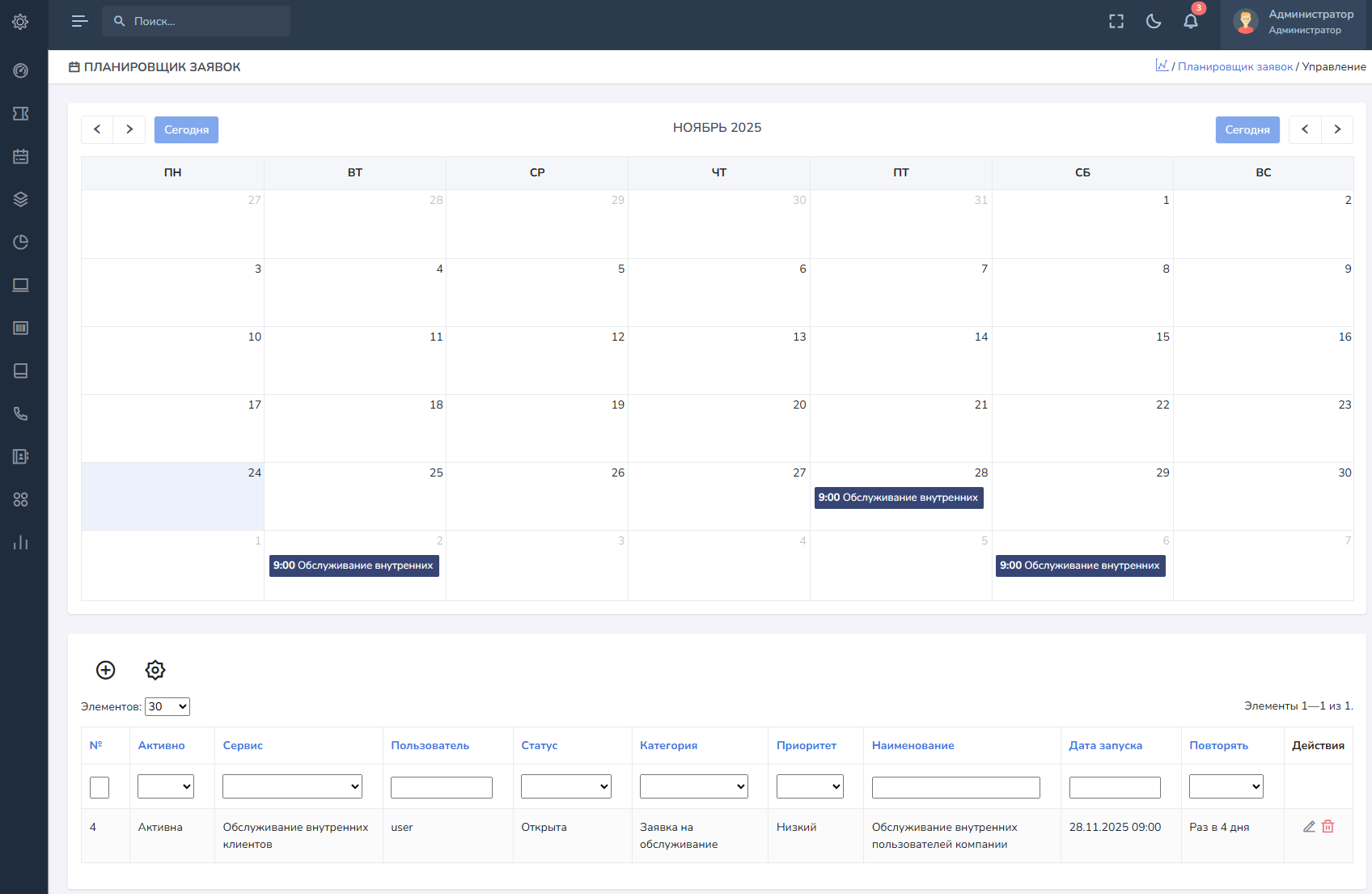 В системе существует механизм, позволяющий создавать заявки, которые будут выполняться по расписанию в указанную дату и время и могут повторяться с интервалами: каждый день, раз в неделю, раз в месяц, раз в год. Все повторяющиеся события отображаются в виджете календаря на дату запуска задачи.