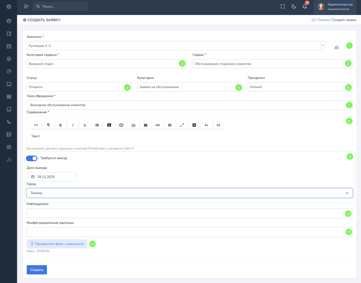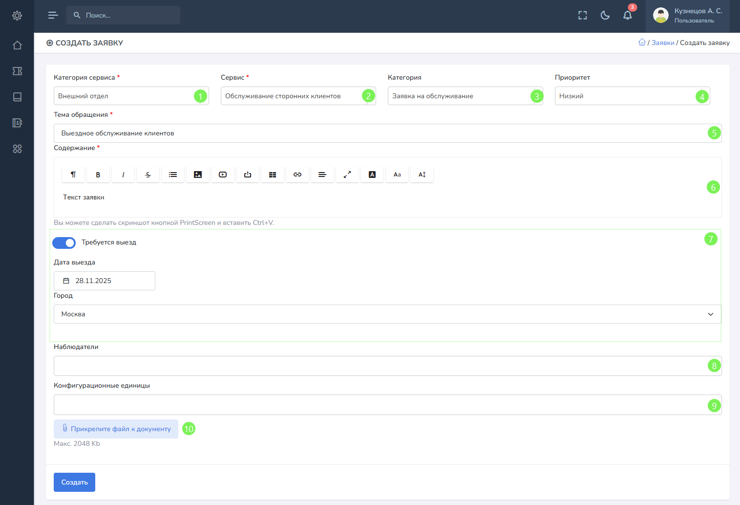 - Статус - при создании заявки исполнитель может сразу назначить заявке выбранный статус. В списке отображаются статусы доступные для роли создающего пользователя.