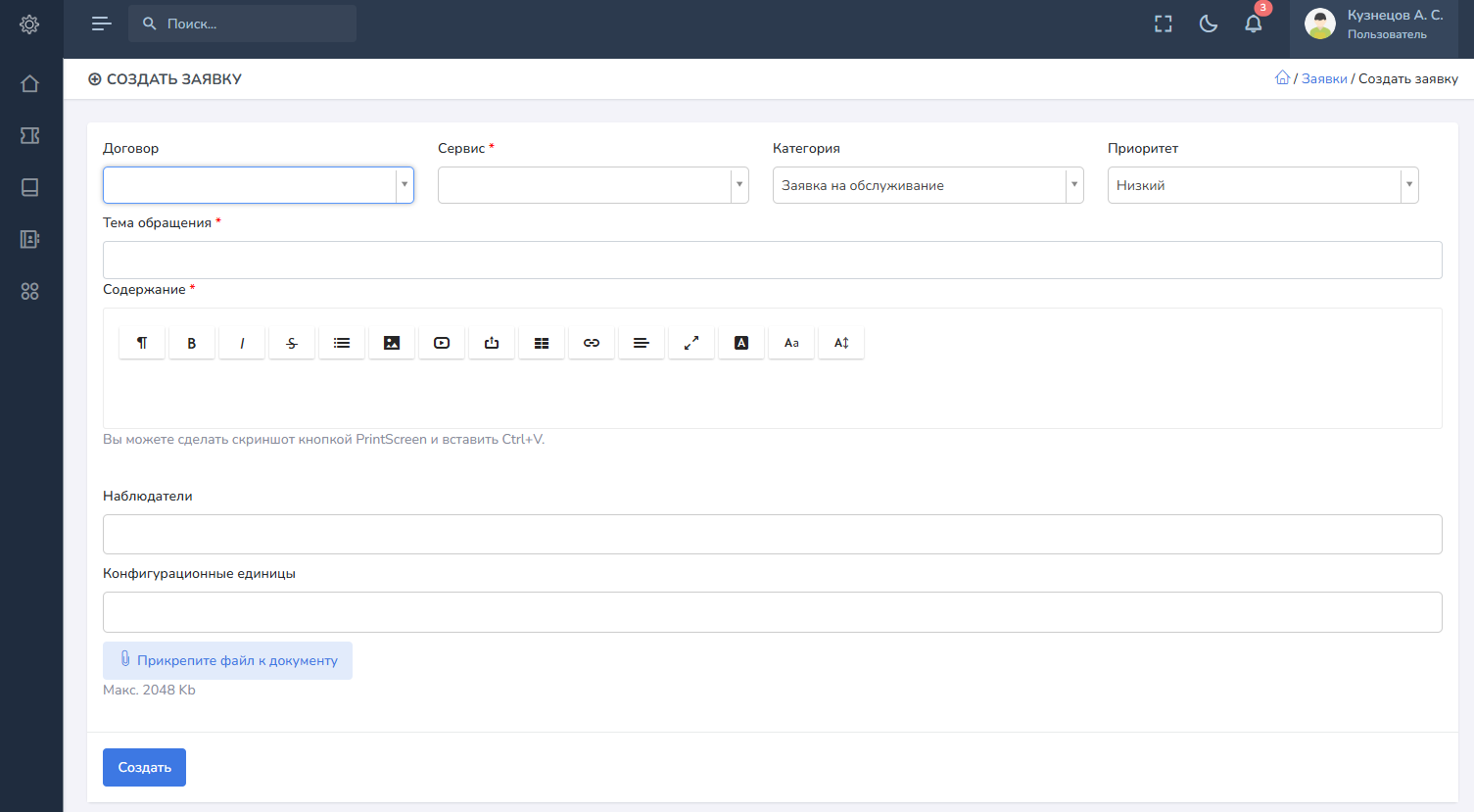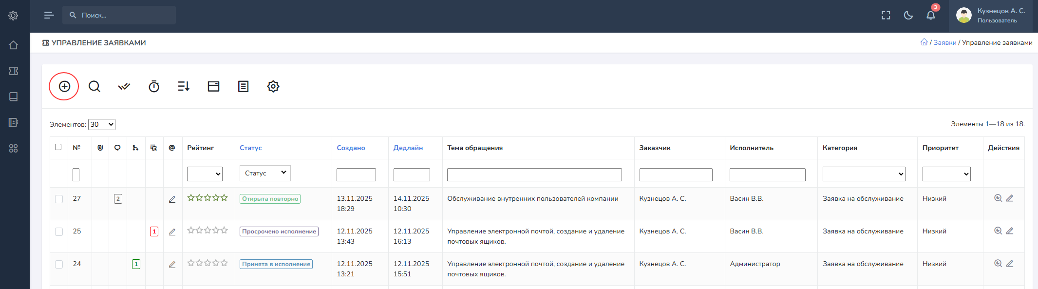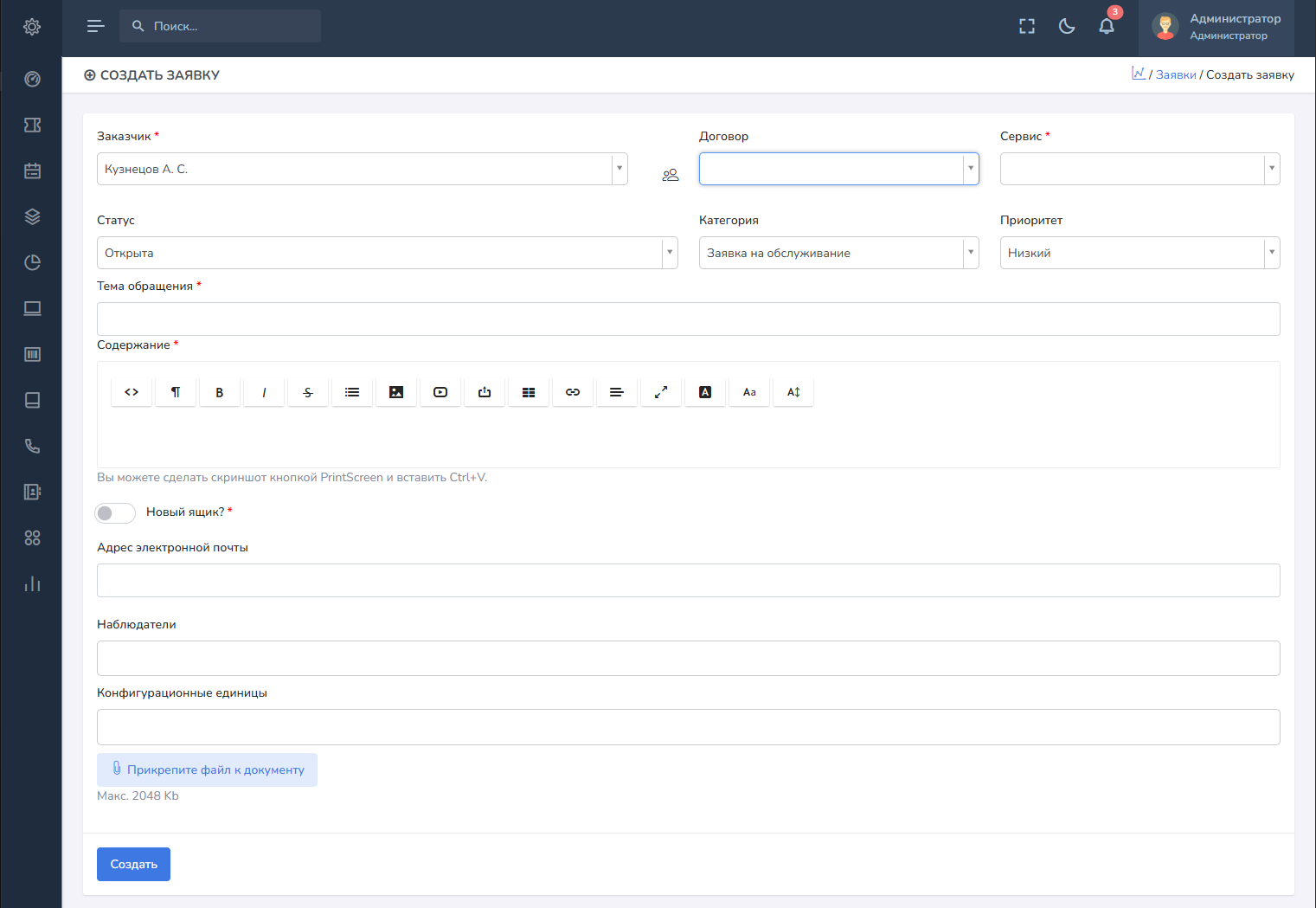 Создать заявку можно не только на панели управления заявками, но и находясь в любом месте системы. Есть меню быстрого создания, позволяющее создать основные элементы системы из любого места.