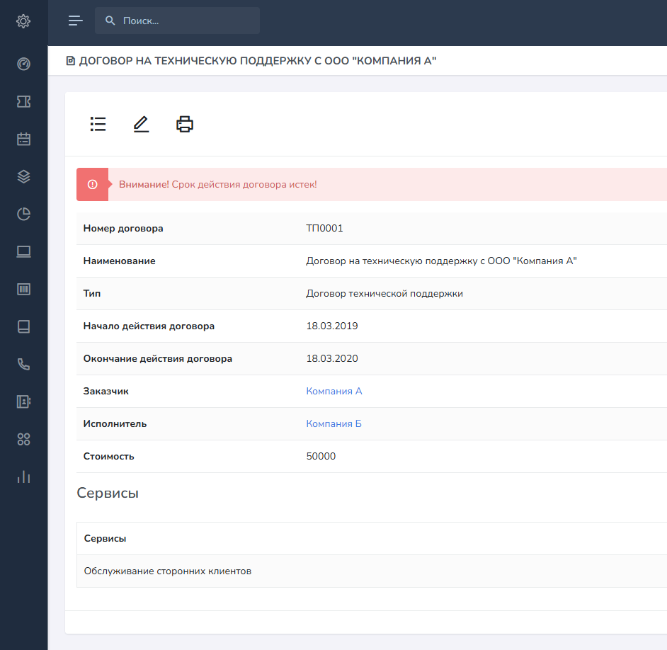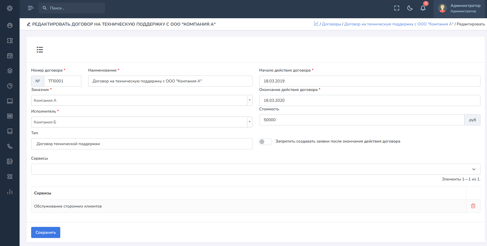Запретить создавать заявки после окончания действия договора - данных переключатель не позволит сотрудникам компании заказчика оставлять заявки через веб-интерфейс системы, в случае, если срок договора истек и предложит продлить договор.
