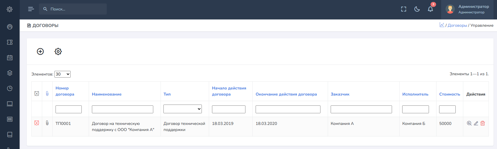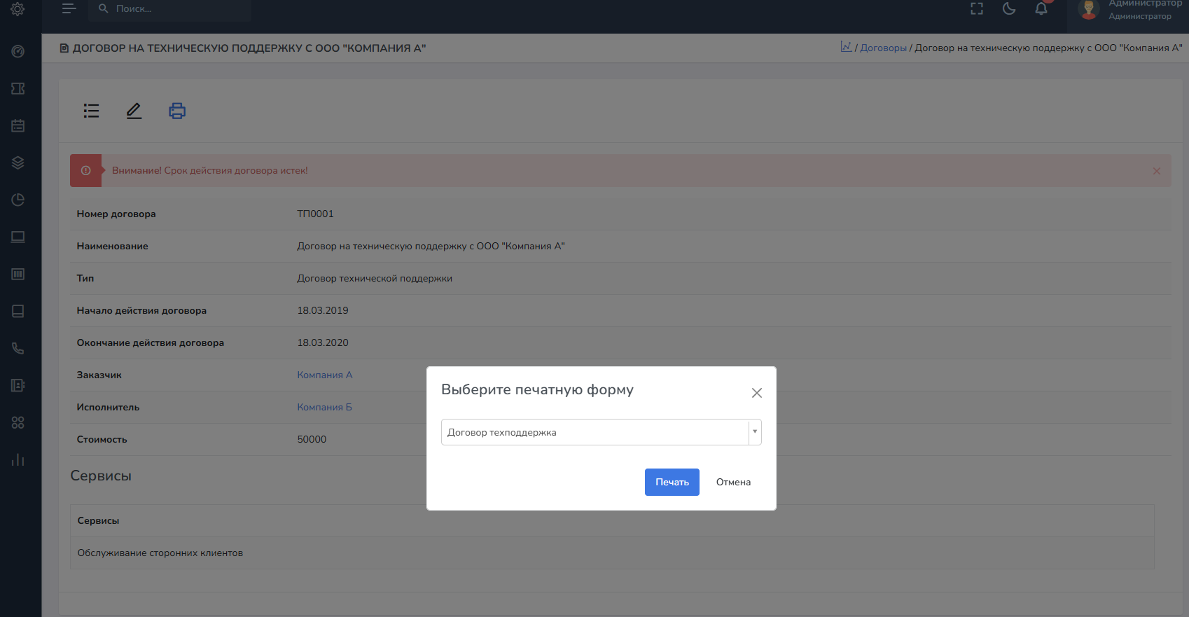 В системе вы можете вести договоры между вами как исполнителем и вашими заказчиками или же между подрядчиками. Каждый договор позволяет распечатать шаблон формы договора, поддерживаются базовые HTML-шаблоны из справочника Шаблоны печатных форм.