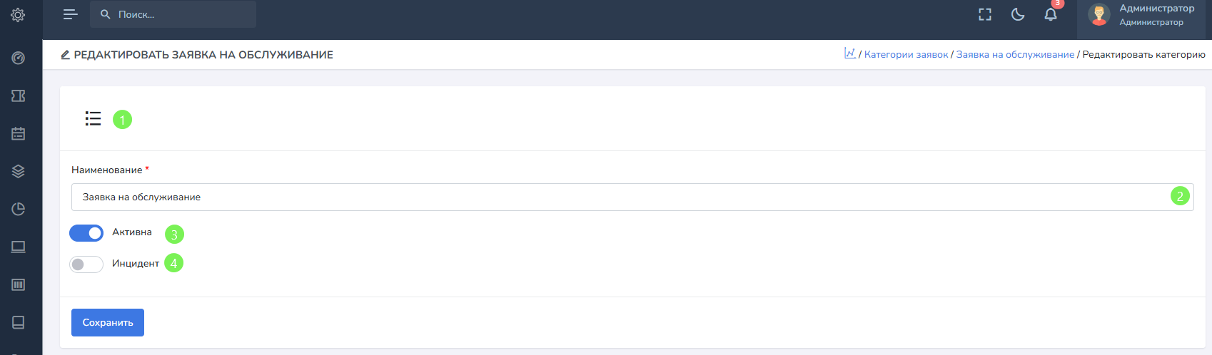 - Активна - данный переключатель позволяет включать / отключать данную категорию.