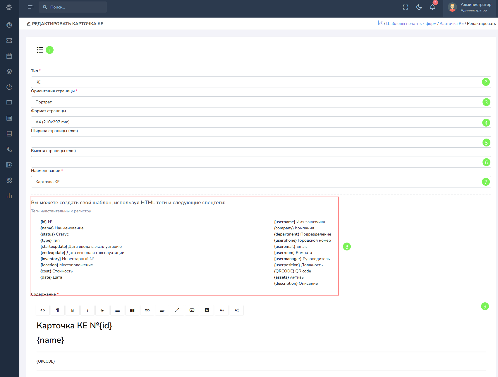 - Содержание - содержание шаблона со всеми тегами, позволяет создавать HTML уведомления в графическом редакторе. Например тег {QRCODE} позволяет вставить на форму QR-код.