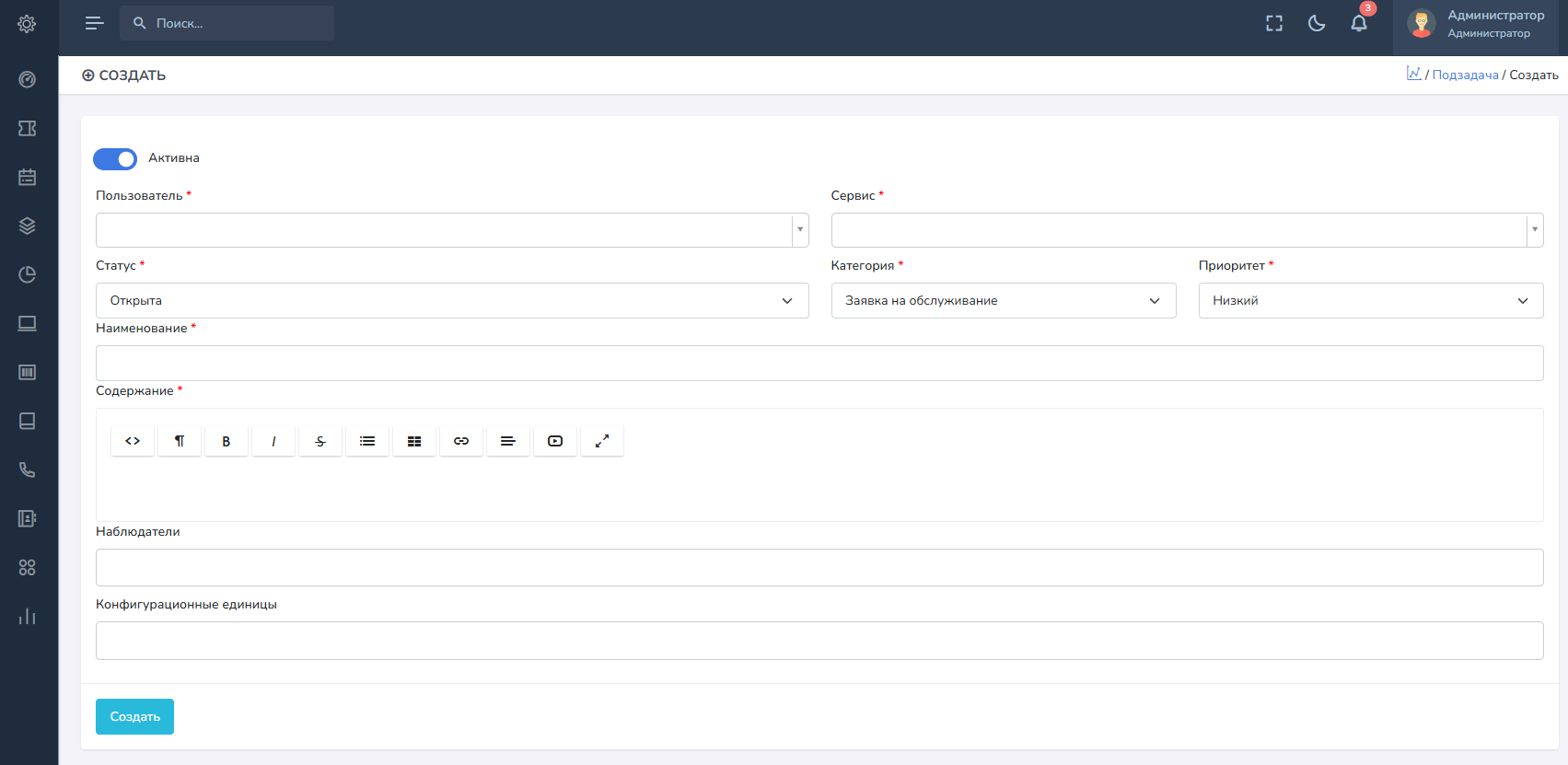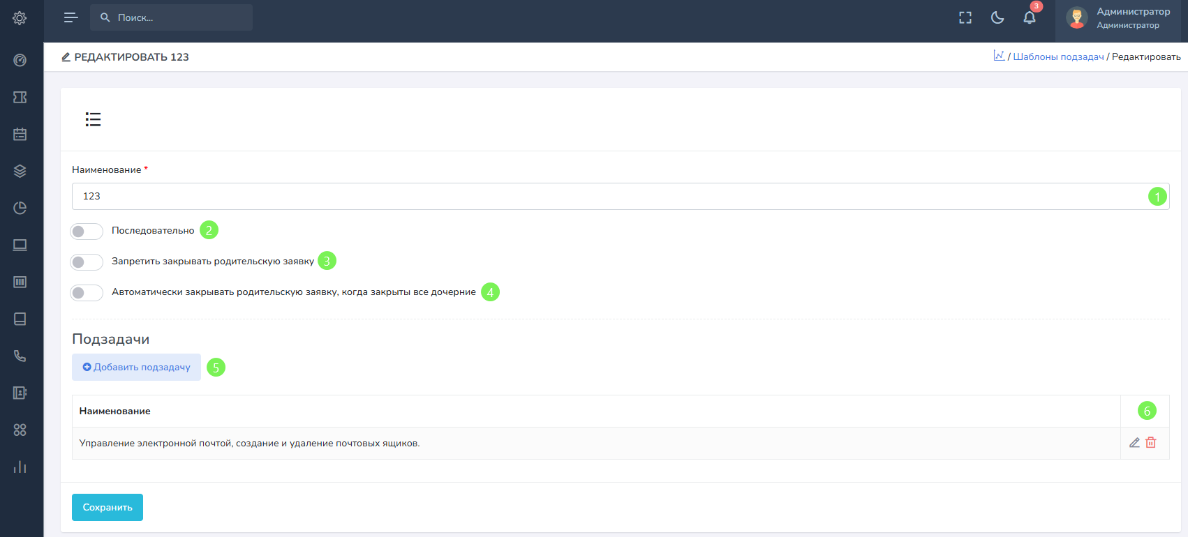 Шаблоны подзадач - в этом справочнике вы можете создать шаблоны, по которым будут создаваться дочерние подзадачи в системе, после создания родительской заявки. Шаблон подзадач прикрепляется к сервису.