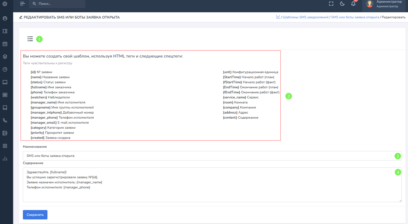 - Содержание - содержание шаблона со всеми тегами, позволяет создавать текстовые уведомления. Учтите что кириллических символов в 1 СМС помещается всего 70, а набранных латиницей 160.