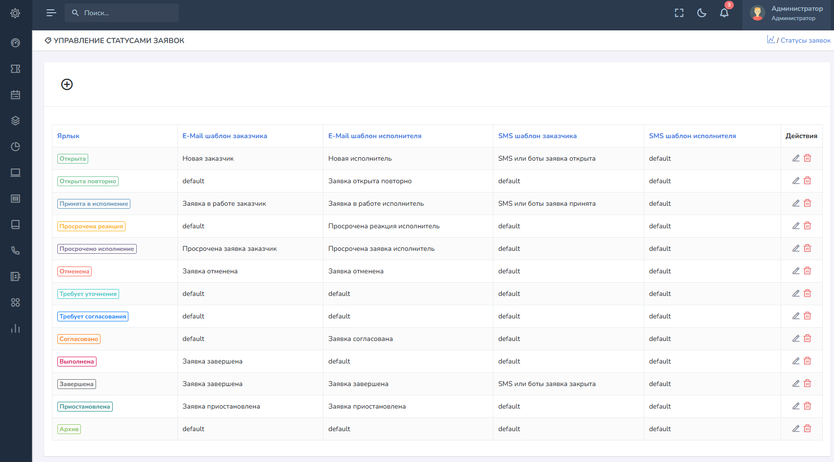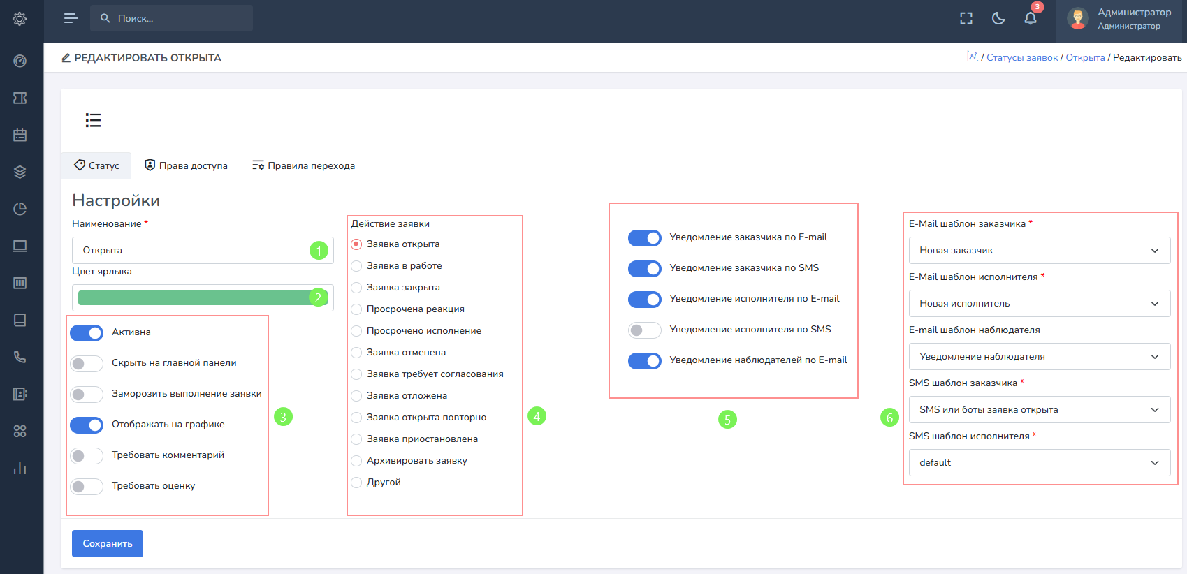 Статусы заявок – это справочник, который позволяет определить список статусов, доступных при создании и редактировании заявок, а также, назначить определенные действия, выбрать параметры оповещения и шаблоны уведомлений по каждому участнику процесса. А также выбрать роли, которым будут доступны данные статусы для выбора и применения к заявке.