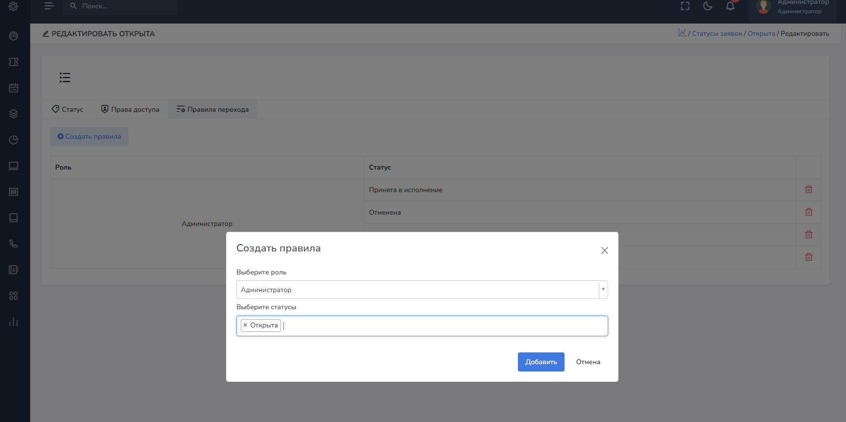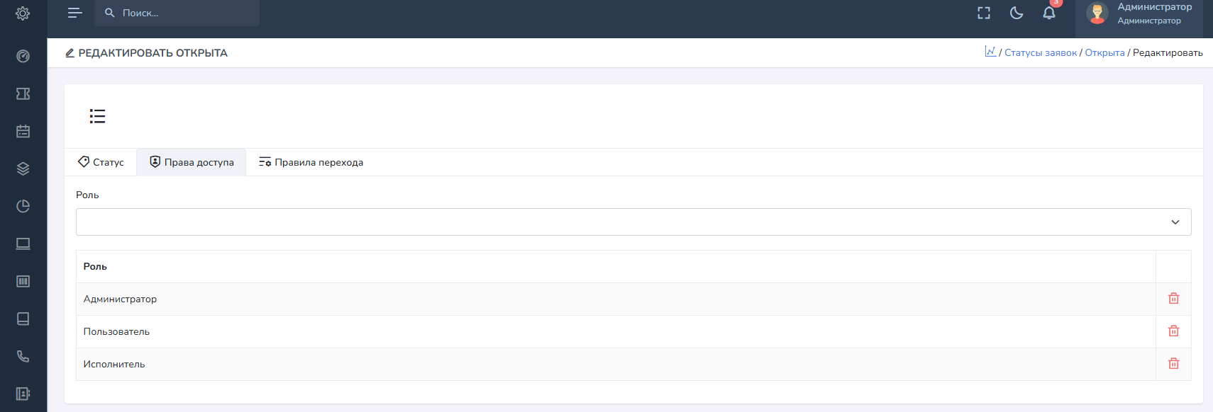 Права доступа - на отдельной вкладке Права доступа, вы можете выбрать роли, которым будет доступно отображение данных статусов при создании / редактировании заявки.