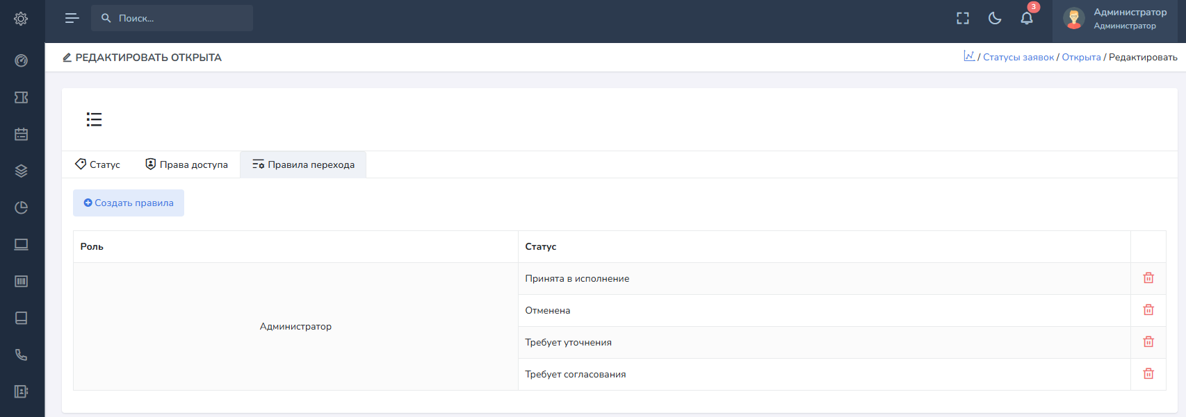 Правила перехода - на отдельной вкладке Правила перехода, позволяют указать для каждого статуса возможность перевода заявки в другие статусы, для каждой роли в системе. Если правила не указаны, то применяются правила доступа на основе роли.