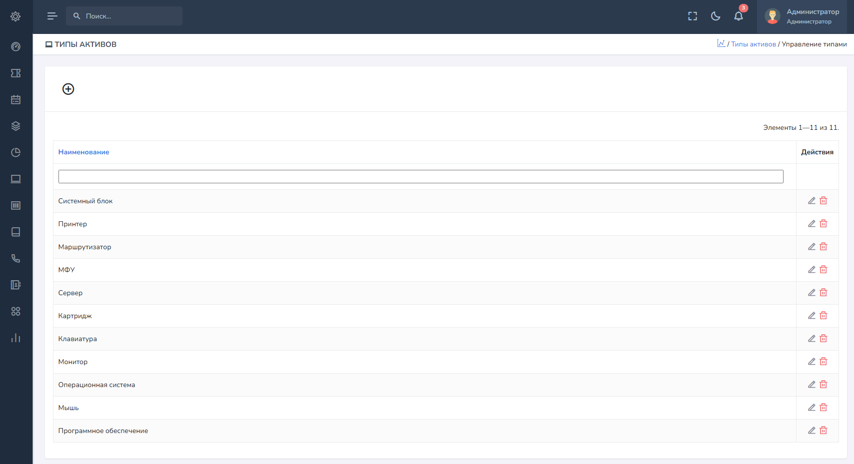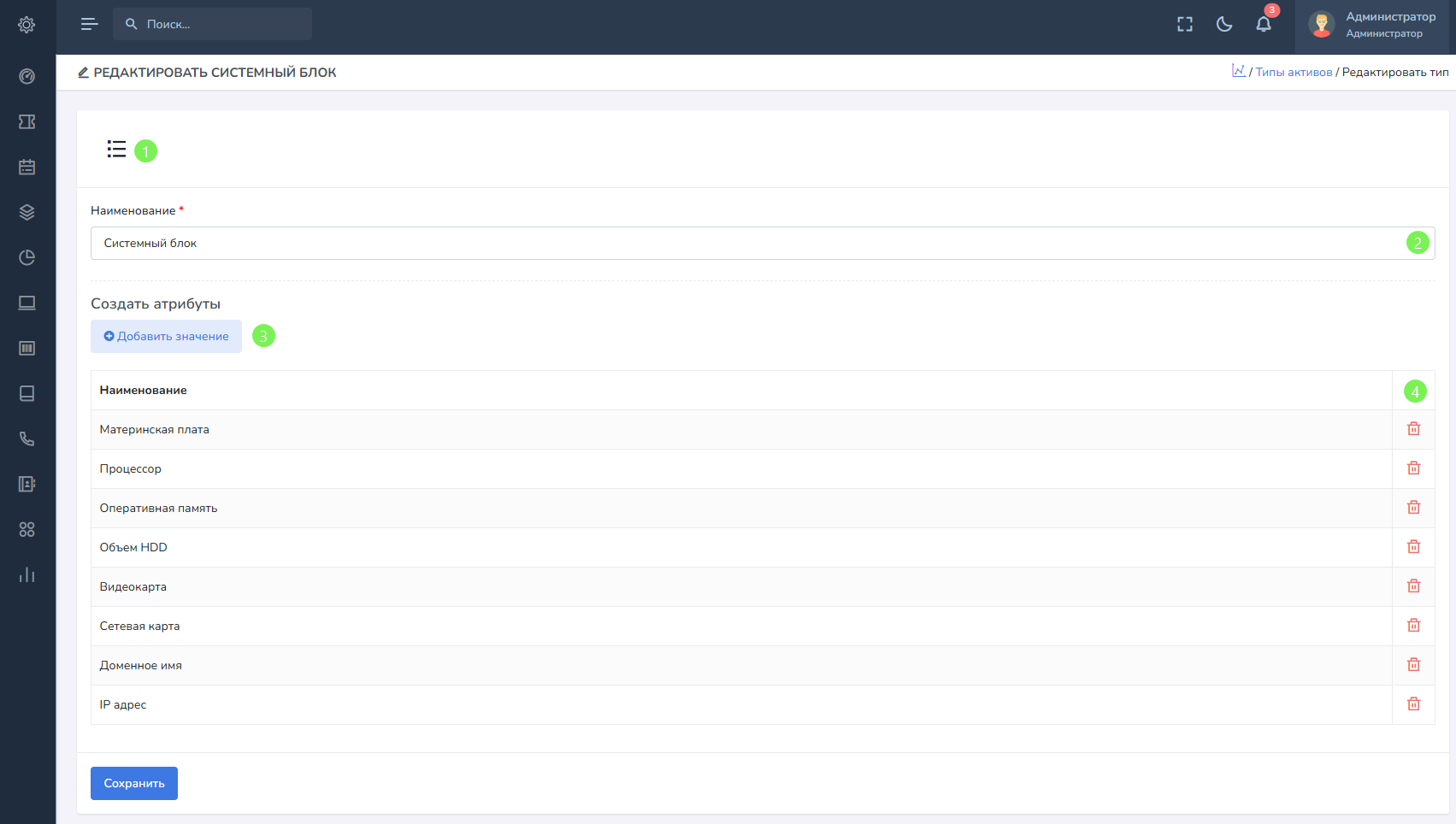 Типы активов – это простой конструктор, позволяющий создавать набор дополнительных полей, используемых при создании активов. Создать типы активов необходимо до создания активов. Например, мы создаем тип актива под названием Системный блок и добавляем набор дополнительных полей.