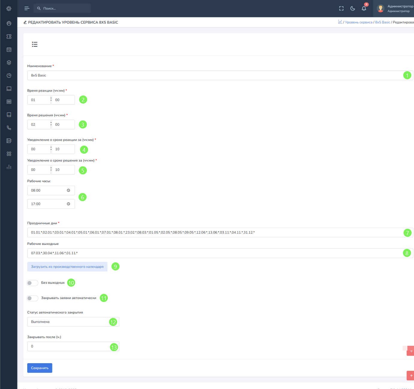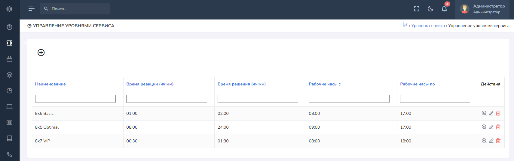 Уровень сервиса (SLA) – это набор метрик, которые используются для исполнения заявок Службой технической поддержки. Уровни сервиса привязываются к каждому Сервису. Данные метрики влияют на срок реакции и исполнения заявки.