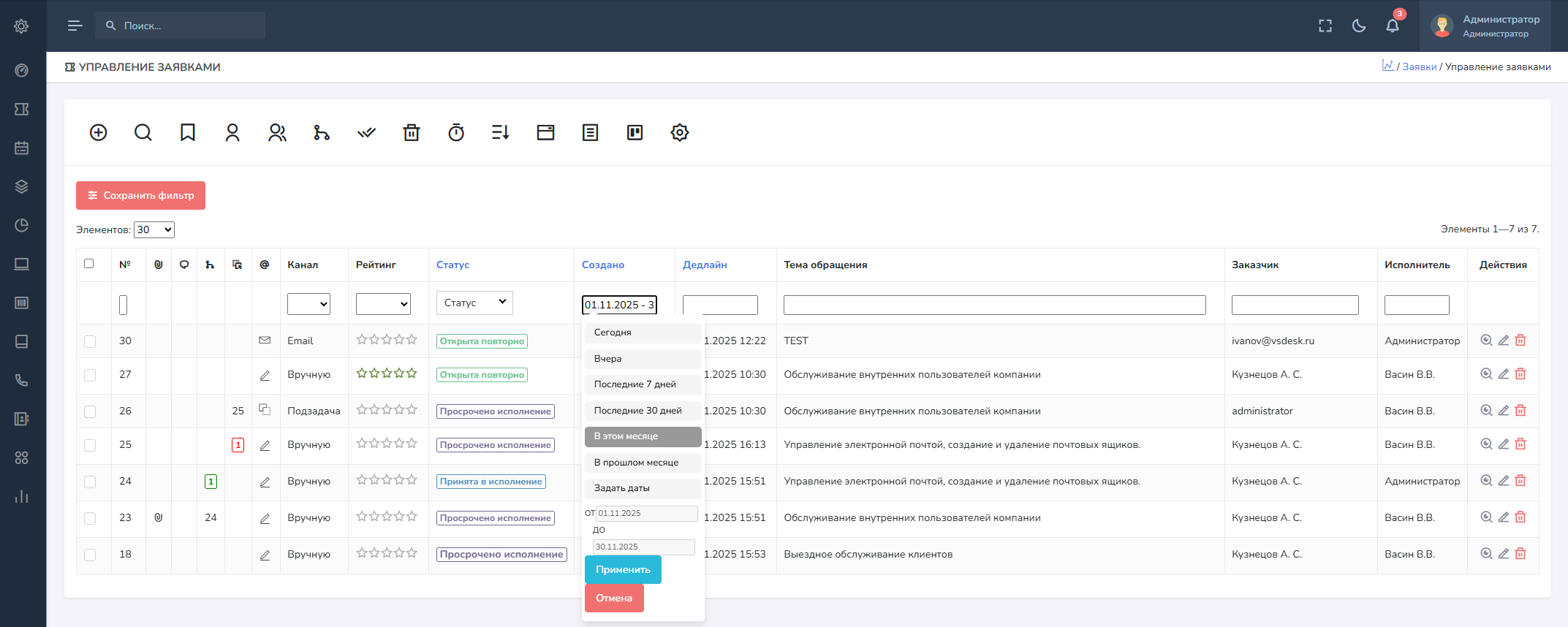 В данной панели расположены поля для фильтрации списка заявок по условиям. Например по умолчанию отображаются заявки только в тех статусах, которые не являются скрытыми, при желании можно отобразить Архивные заявки, для этого в поле фильтра "Статус", необходимо выбрать из списка Статус "Архив". Это удобно, если вместо удаления заявок используется архивация. Поля с какими либо датами отображают расширенный вариант выбора диапазона дат. Есть обычные текстовые поля, которые допускают точное совпадение с набранным в поле фильтра текстом.