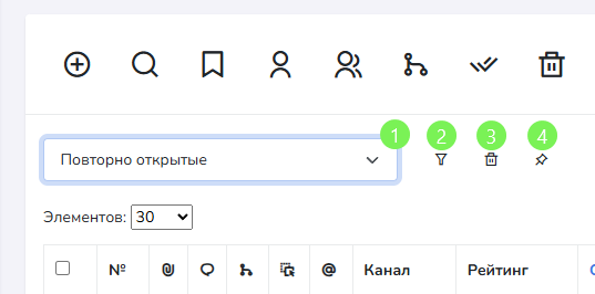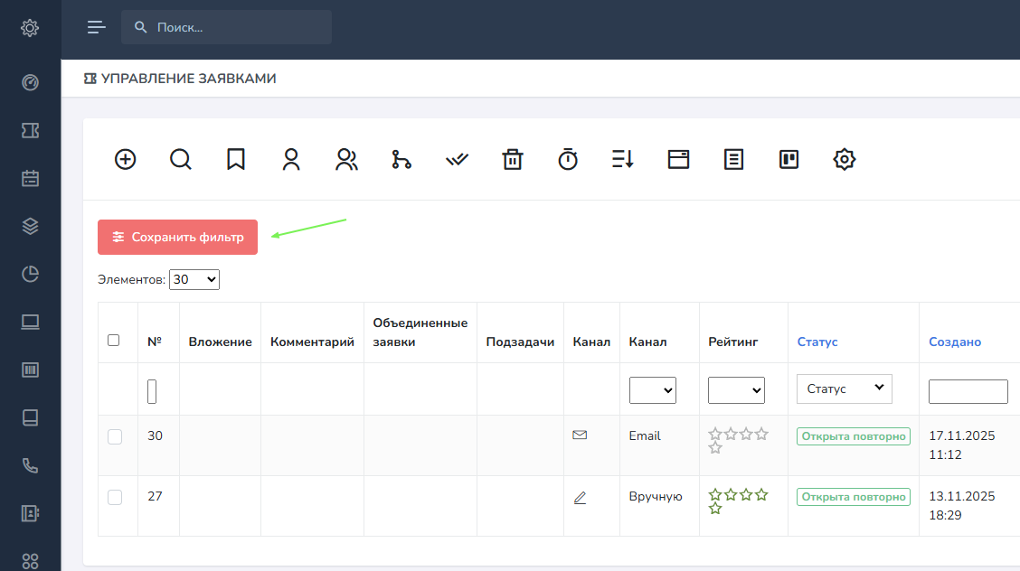 - Количество отображаемых записей на страницу и сохраненные фильтры - по умолчанию выбраны 30 элементов, доступны 10, 30, 50, 100, 500, 1000, 1500, 2000, 3000, 5000. Сохраненные фильтры позволяют быстро отфильтровать и сохранить / удалить пресет в списке.