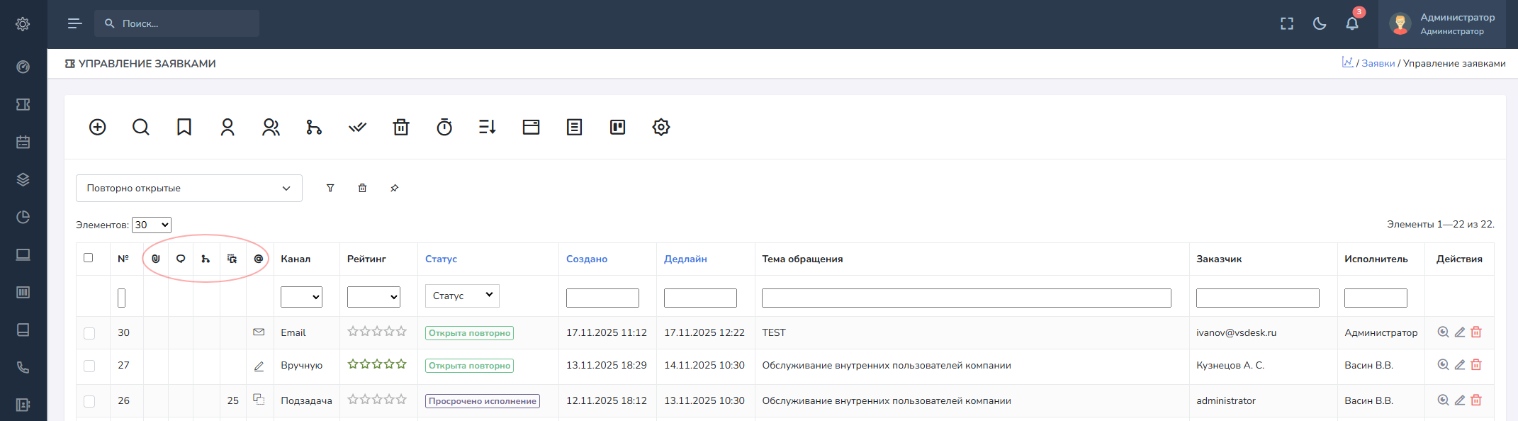 В списке заявок имеются дополнительные информационные столбцы, которые позволяют получить некоторую информацию о заявке не заходя в нее.