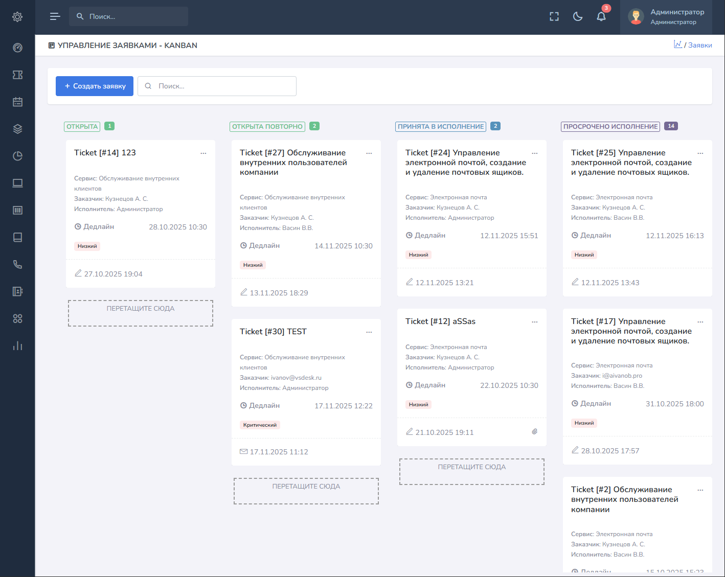 В данном режиме заявки отображаются в виде доски кан-бан c возможностью перетаскивания заявок между статусами. (Это бета функционал и может работать нестабильно).