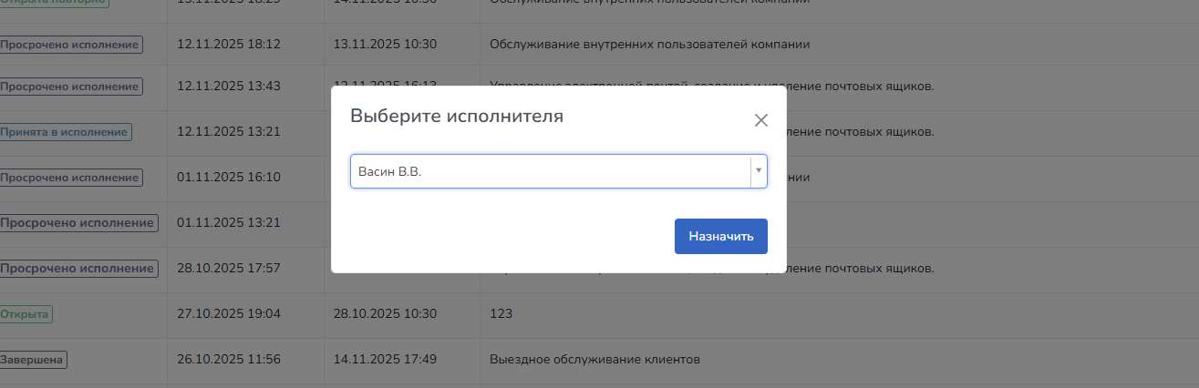 Модальное окно назначения исполнителя.