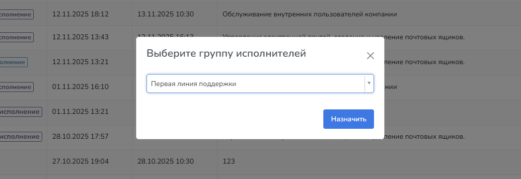 При нажатии на данную кнопку можно переназначить группу исполнителей у выбранных заявок. Это массовое действие доступно только при наличии определенных прав.