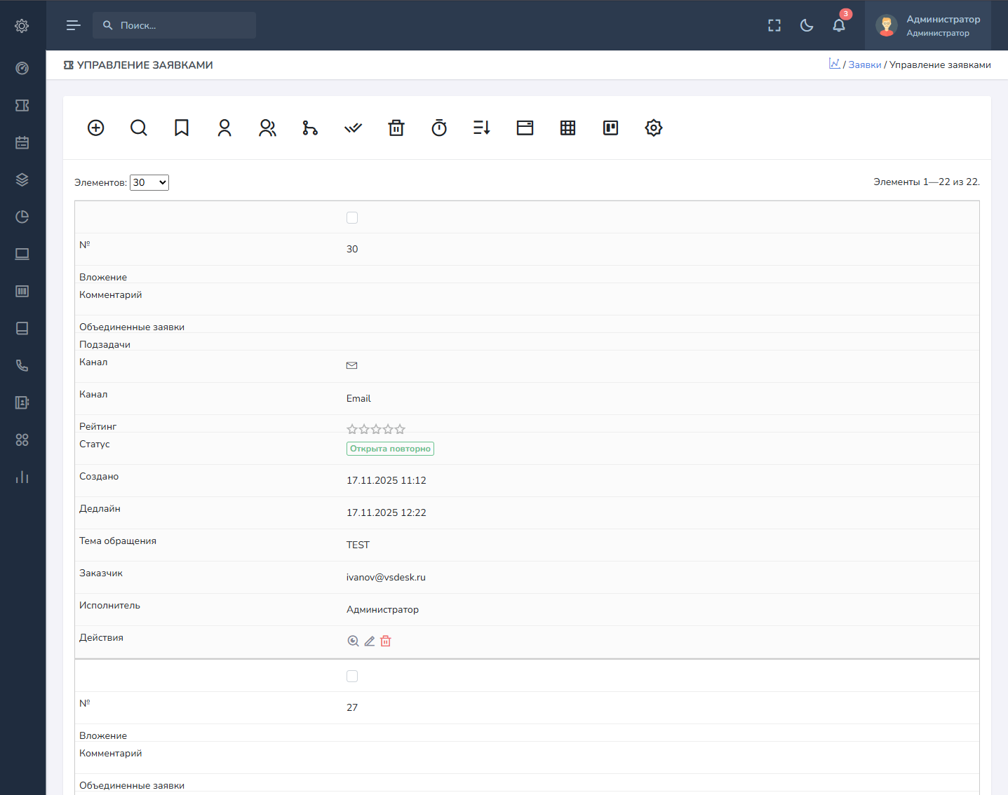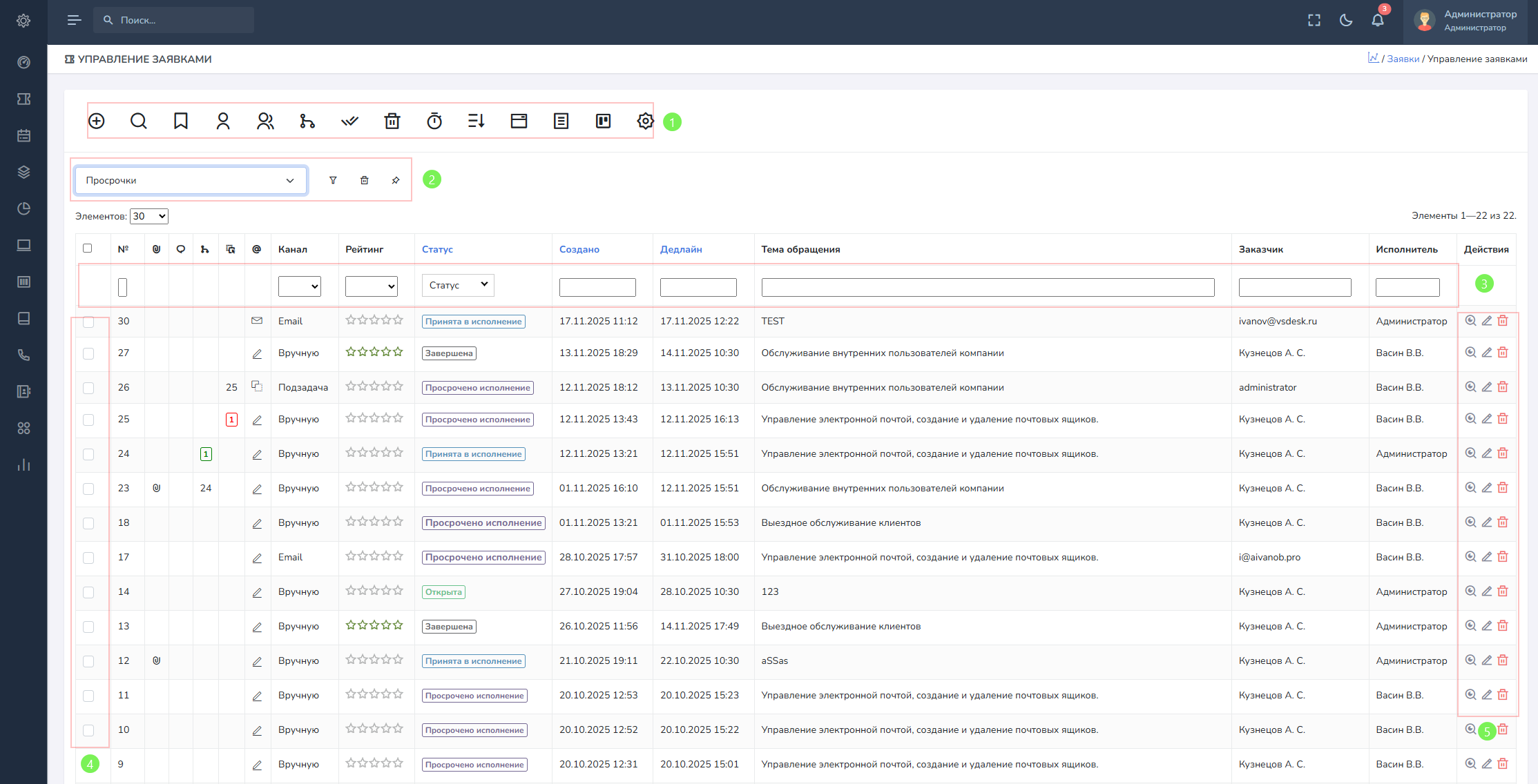 - Панель управления - позволяет выполнять одиночные и групповые действия с заявками.