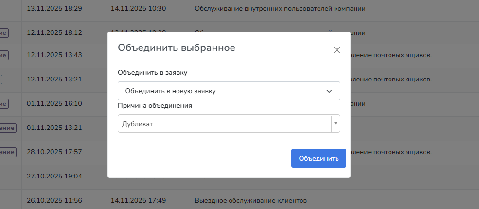 При нажатии на данную кнопку можно объединить выбранные заявки в одну из существующих или создать новую и объединить с выбранными, указав при этом причину объединения. Действия с родительской заявкой автоматически распространяются на объединенные. Это массовое действие доступно только при наличии определенных прав.