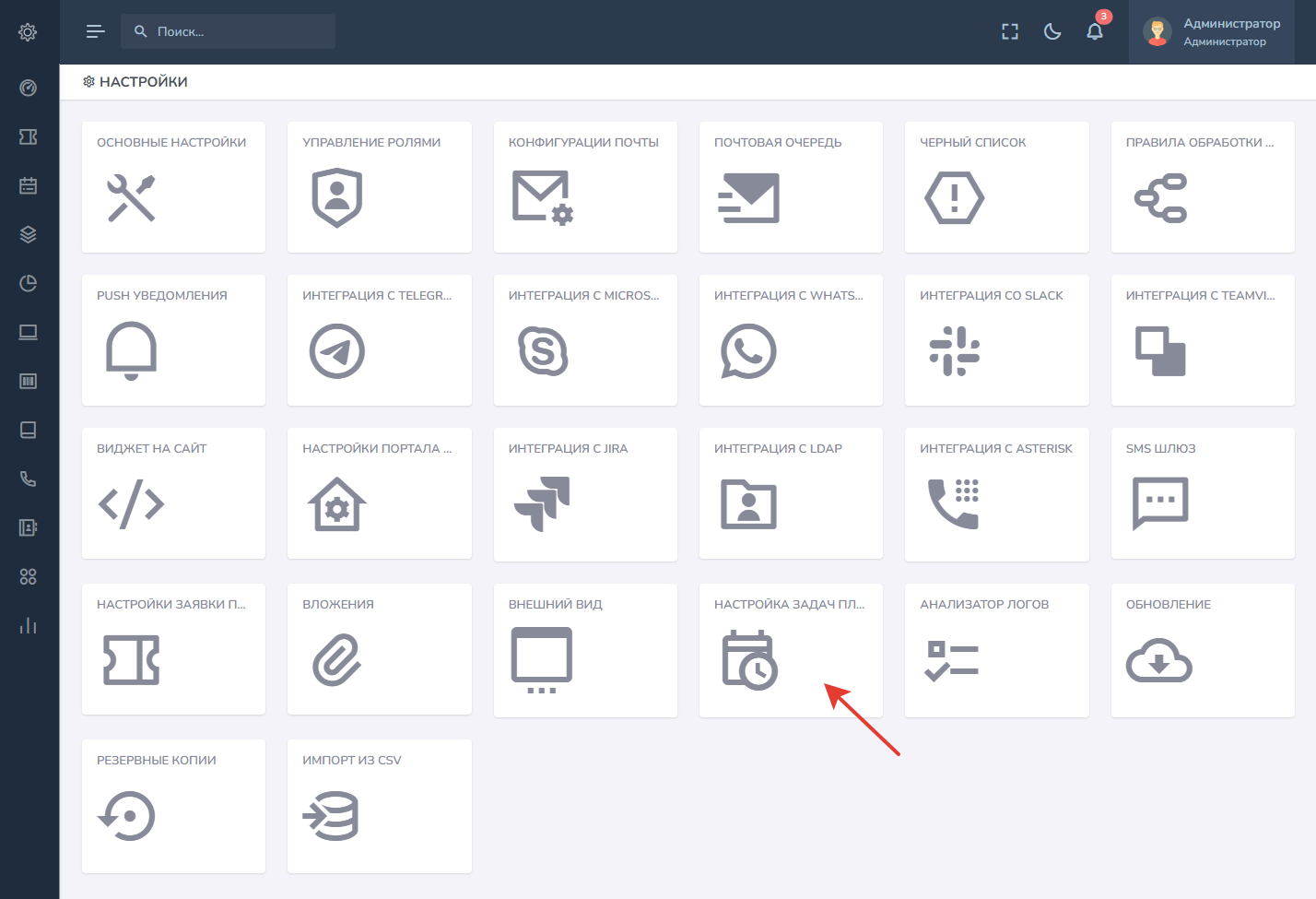 После первого входа с учетной записью Администратора, вам необходимо инициализировать задачи системного планировщика. Для этого перейдите в меню Профиль пользователя - Настройки - Настройка задач планировщика, запустить кнопку Сброс по умолчанию!