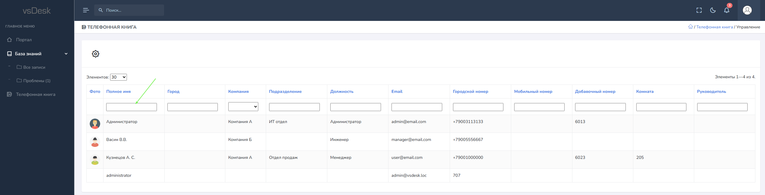 На портале может отображаться Телефонная книга, если включить данную настройку, там будут отображаться контактные данные всех сотрудников, с возможностью поиска по столбцам.