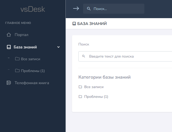 В Базе знаний на портале отображаются списком все записи, с возможностью поиска по доступным категориям и в левом боковом меню можно получить доступ записям каждой категории по отдельности