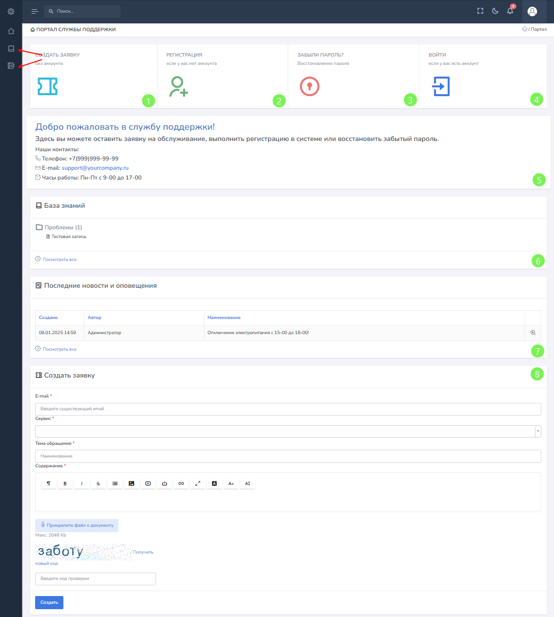 8) Блок Создать заявку - в этом блоке пользователь сможет оставить заявку без регистрации в системе, прикрепить файлы или скриншоты. Ввод символов Captcha может быть отключен в настройках портала, а так же возможно включить выбор сервиса, при создании заявки.