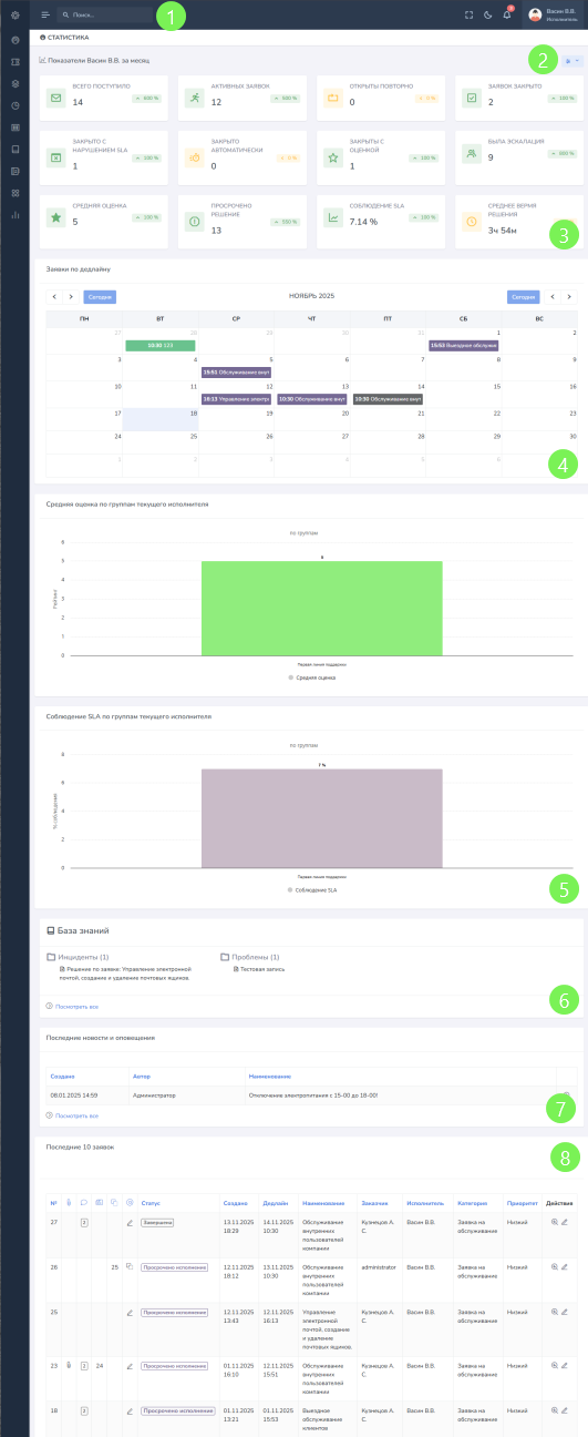 Отображение виджетов зависит от настроек роли в системе, по умолчанию у роли Пользователь не будут отображаться графики, виджет Заявки по дедлайну и статистика исполнителя. У Исполнителя отображются только графики текущего пользователя, у Администратора отображаются все, кроме графиков текущего пользователя.